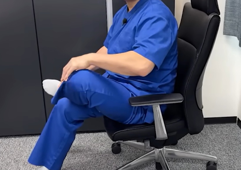 椅子に座り、痛みがある方の足首を、反対側の膝の上に乗せます。上から見た時に、足で数字の[4]の字を作るような形です。