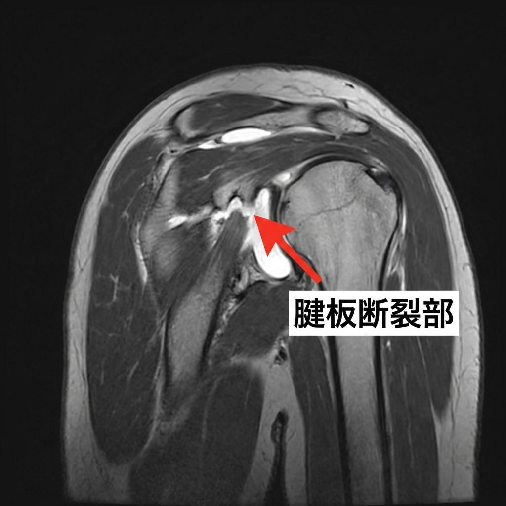 - MRI検査: 腱板断裂の診断において最も精度が高い検査です。断裂の大きさや位置、筋肉の状態まで詳細に評価でき、治療方針を決める上で非常に重要です[2]。