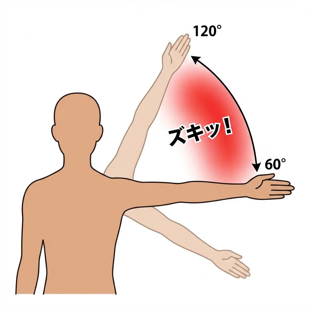 ✅ 腕を上げようとすると、特定の角度(60度〜120度くらい)で特に痛みが強い。