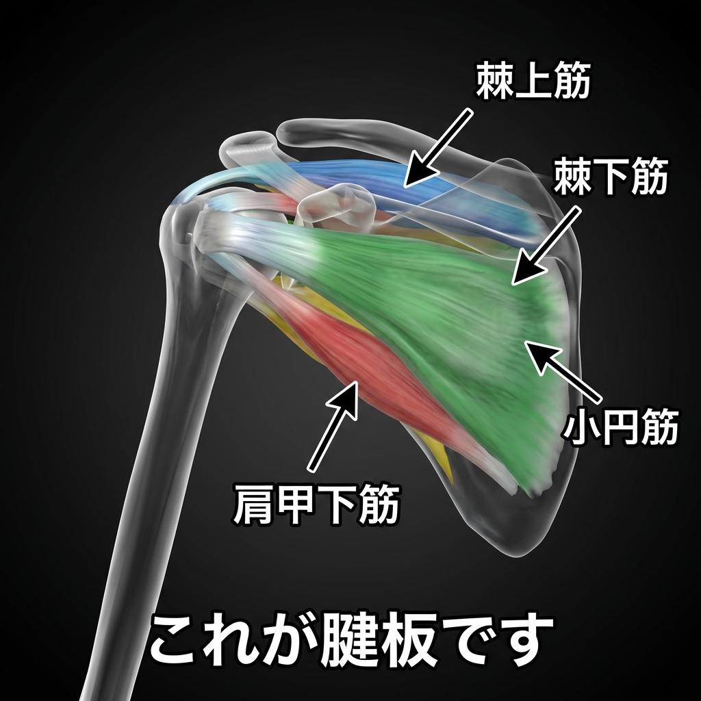 肩関節は、骨や軟骨だけでなく、「腱板」という4つの筋肉(棘上筋、棘下筋、肩甲下筋、小円筋)の腱が集まって板のようになった組織によって、安定性が保たれています。