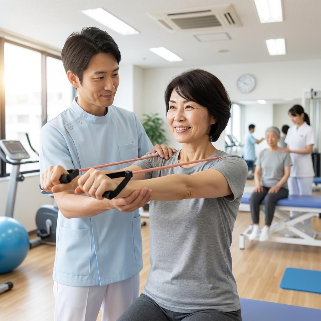 理学療法士の指導のもと、固まった関節の動きを広げる訓練や、肩周りのインナーマッスルを強化するトレーニング(振り子運動・チューブトレーニングなど)を行います。