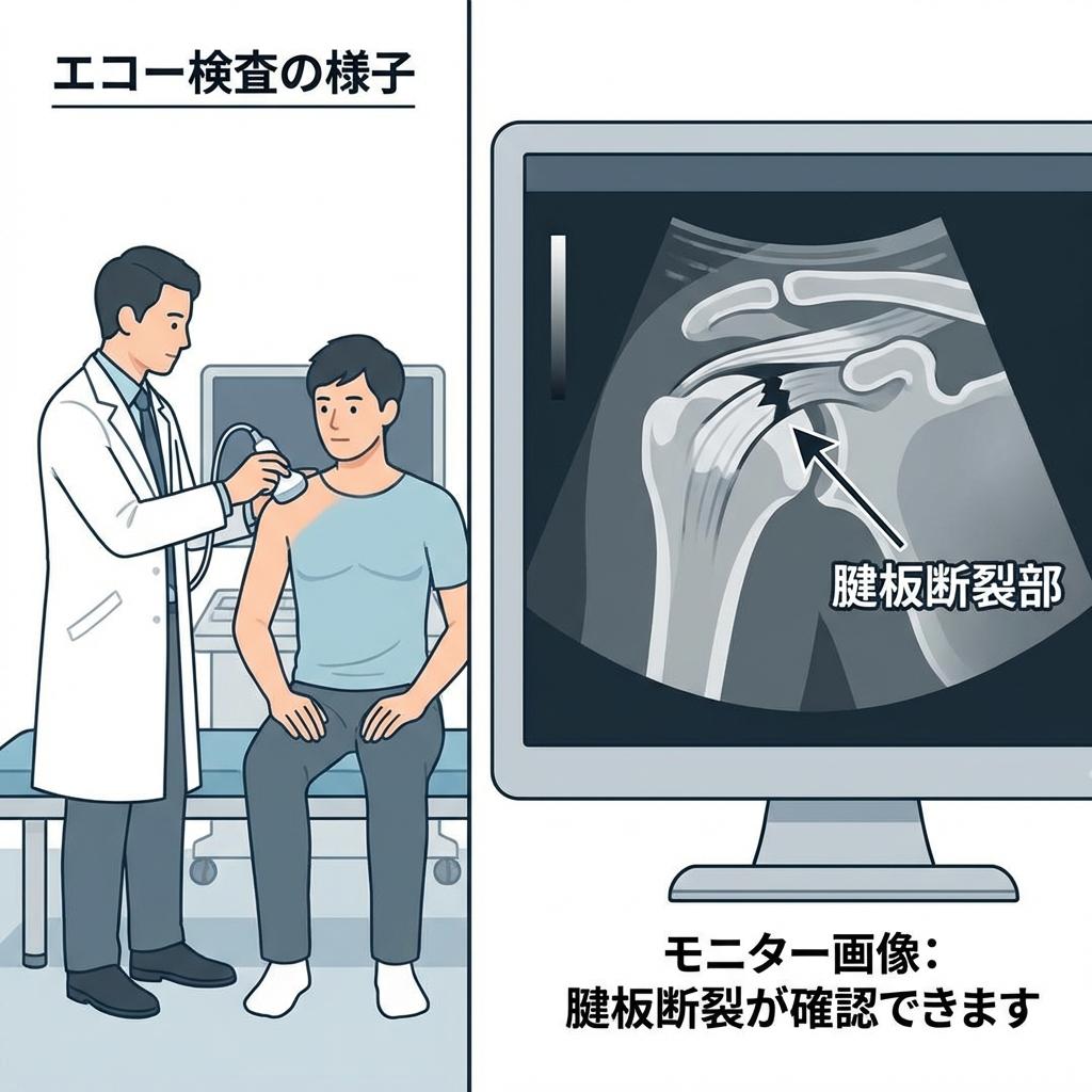 | 超音波(エコー)検査 | 体に負担がなく、リアルタイムで腱の動きを確認できる。完全断裂の診断においてはMRIに匹敵する精度を持つと報告されている。[4] |