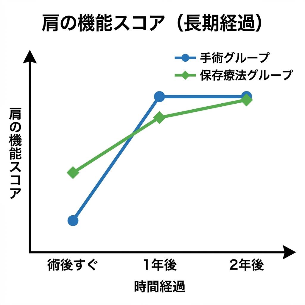 具体的には、手術グループと保存療法グループを比較したところ、1年後の時点では手術グループの方が肩の機能スコアや痛みのスコアがわずかに良い結果でしたが、その差は「患者さんが実感できる最小の改善」には達していませんでした。